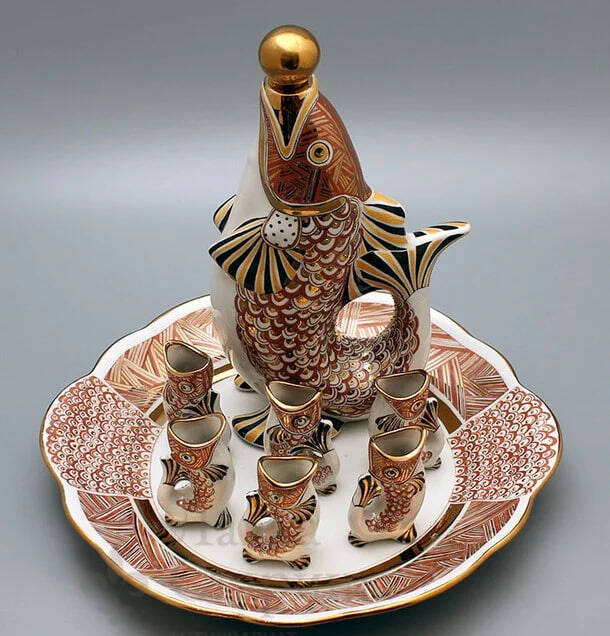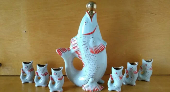 По задумке, компания из шести человек могла использовать комплект за праздничным столом следующим образом: в большую рыбу наливали вино, коньяк или настойку, а из маленьких — пили. Классическая сервировка для застолья.