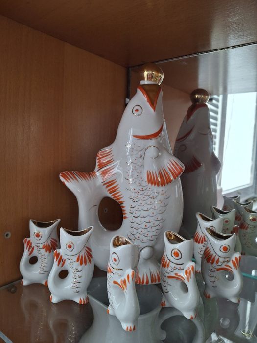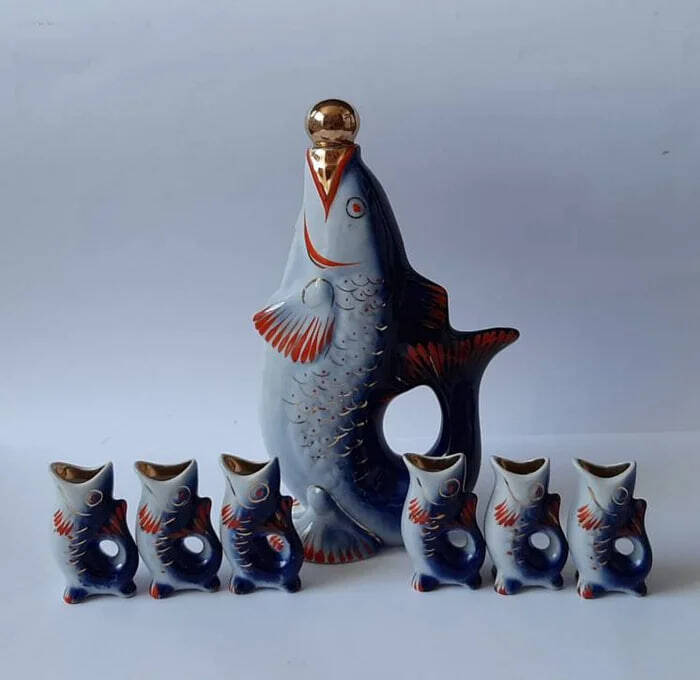 Начнём с шокирующего разоблачения. Та самая большая рыбина — вовсе не сувенир и не копилка. Это караф — сосуд для напитков, рассчитанный примерно на 0,7 литра. А шесть маленьких рыбок — это рюмки объёмом около 30 миллилитров каждая.
