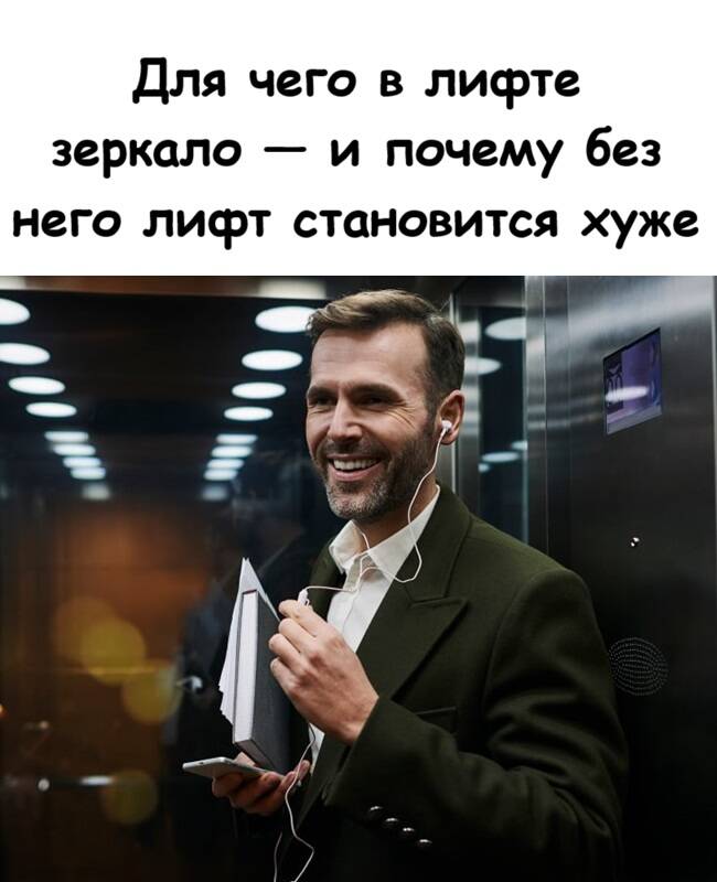 Ну и банально: люди любят смотреть на себя. Это приятно, это поднимает настроение, это помогает чувствовать себя увереннее. Лифт — одно из немногих мест в общественном пространстве, где можно мельком глянуть на себя в полный рост и убедиться, что всё в порядке. Это мелочь, но из мелочей складывается общий комфорт.