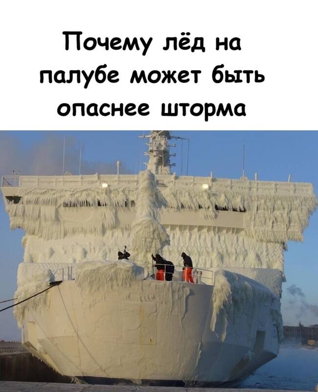 Запас остойчивости. Корабль проектируют так, чтобы он мог выдержать определённое количество льда на палубе, прежде чем потеряет устойчивость. Но этот запас не безграничен, и когда природа «перевыполняет план», спасает только тяжёлая работа экипажа.