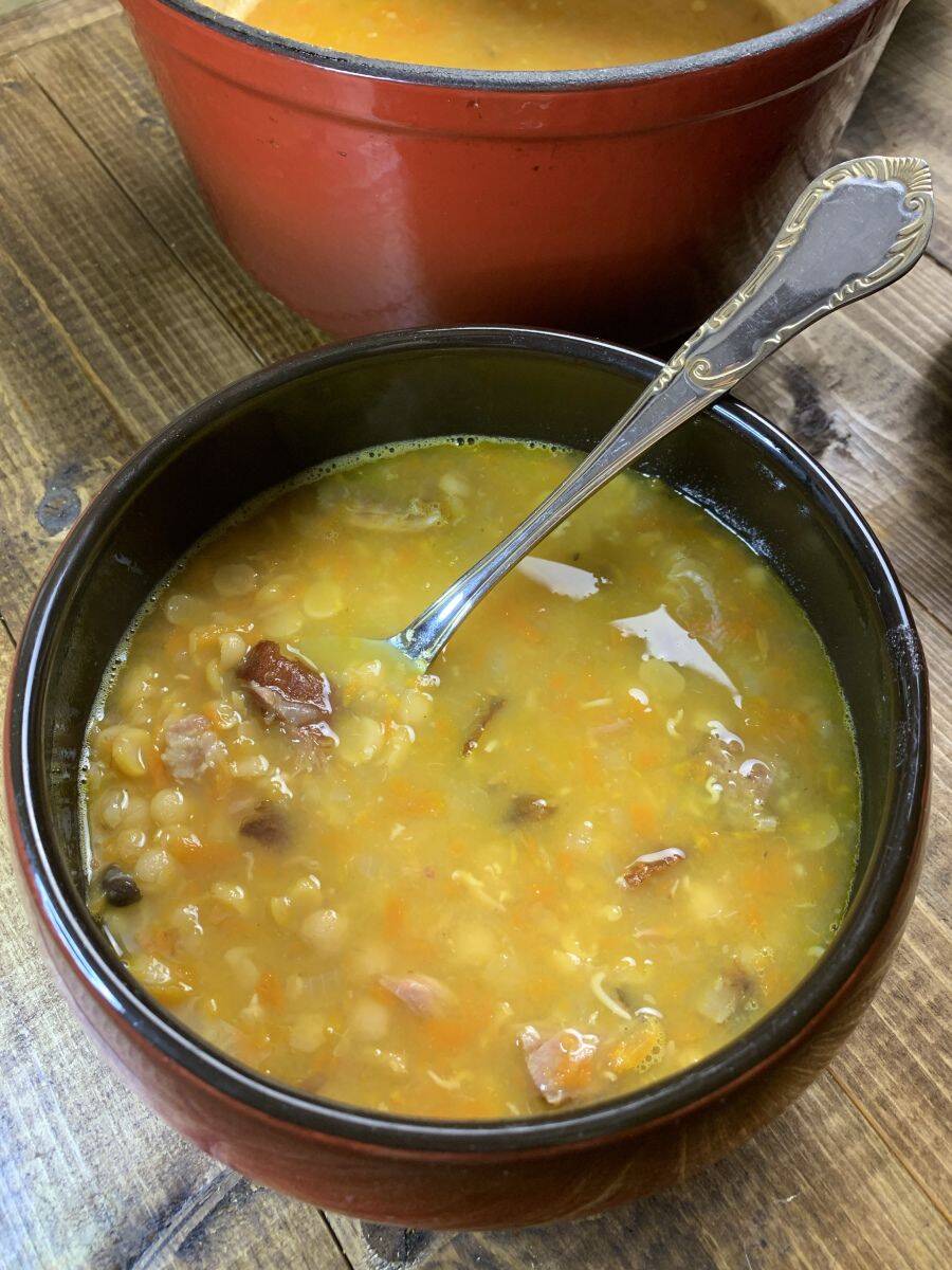 Кстати, если вы консервируете горошек сами (или просто отвариваете свежий или замороженный), сливать жидкость тоже не обязательно. Отвар от варёного горошка — это та же аквафаба, только ещё более насыщенная. Его можно использовать точно так же: для супов, соусов, теста.