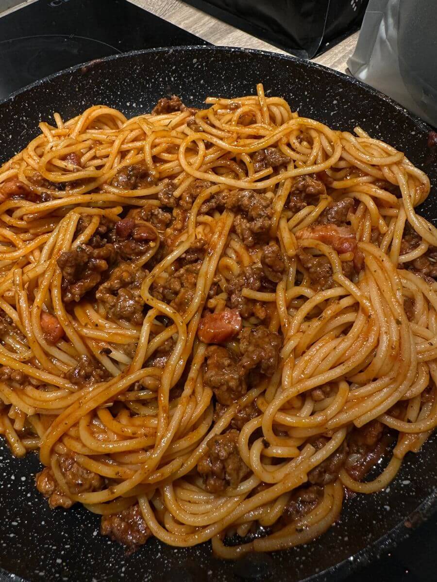В итоге макароны не разваренные, а упругие, с приятной текстурой, пропитанные соком мяса и лука, с лёгким ореховым привкусом от обжарки. Это совсем не то, что получается, когда просто смешиваешь отварные макароны с фаршем. Попробуйте — разница будет очевидна.