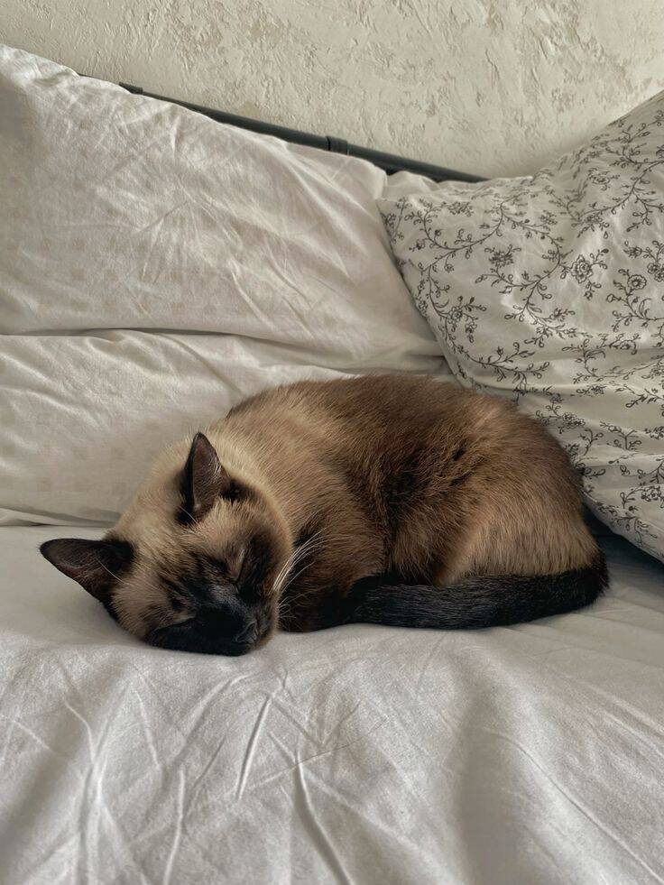 Калачиком, прижав хвост к мордочке — попытка сохранить тепло и защититься. Если кошка спит калачиком на вашей кровати, но не касается вас — возможно, ей немного тревожно или холодно. Она рядом с вами, но держит дистанцию.