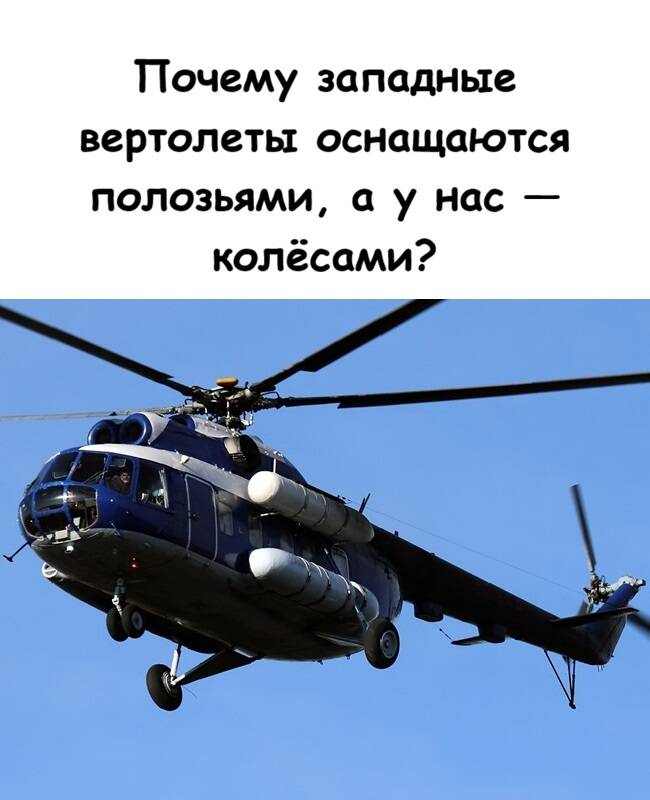 У нас много тяжёлых вертолётов (Ми-8, Ми-26), поэтому и колёс много. На Западе — больше лёгких машин, поэтому и полозьев.