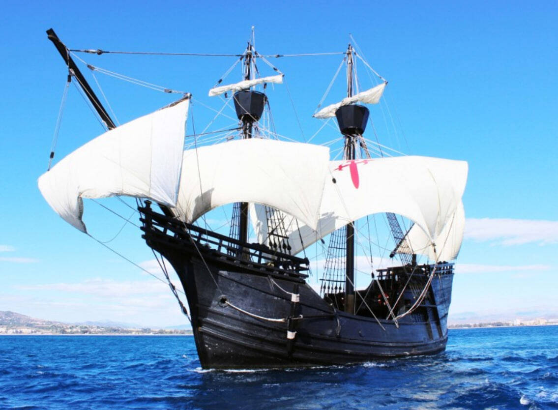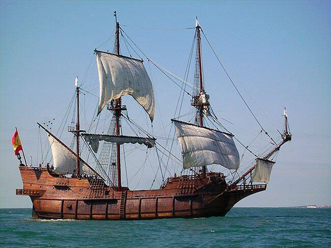 Сегодня мы пересекаем океан на лайнерах с бассейнами, ресторанами и каютами с кондиционером. А в XV–XVI веках люди плавали на деревянных скорлупках. Флагман Колумба «Санта-Мария» — всего 26 метров в длину. Это примерно как два автобуса, поставленных друг за другом. Водоизмещение — 100–150 тонн. Для сравнения: современный танкер — 500 000 тонн.