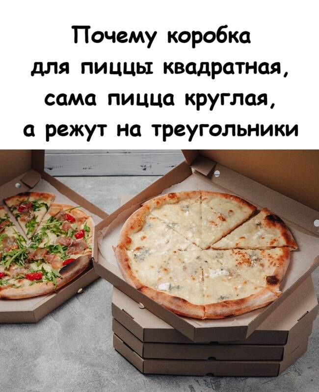 Теперь логичный вопрос: если уж пиццу режут на треугольники, почему она сама круглая? Почему не сделать пиццу квадратной, чтобы подогнать её под коробку?