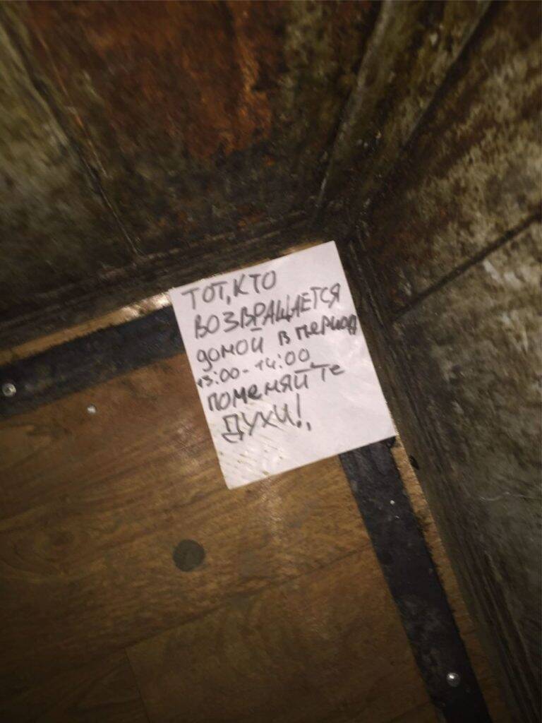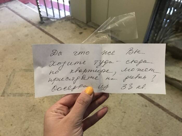 7. "Я разные истории про конфликты с соседями слышала, но вот наша соседка снизу несколько раз приходила жаловаться на то, что мы ходим по квартире. Вчера вот оставила записку"