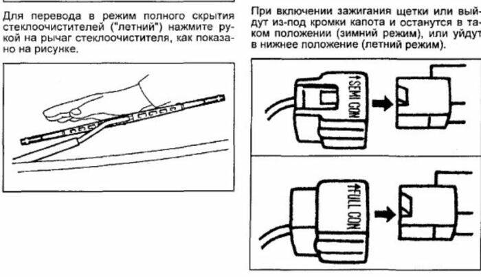 Чтобы перевести дворники в зимний режим, достаточно выключить зажигание, переставить вилку в нужное положение и снова включить машину. После этого при парковке щетки будут останавливаться выше обычного.