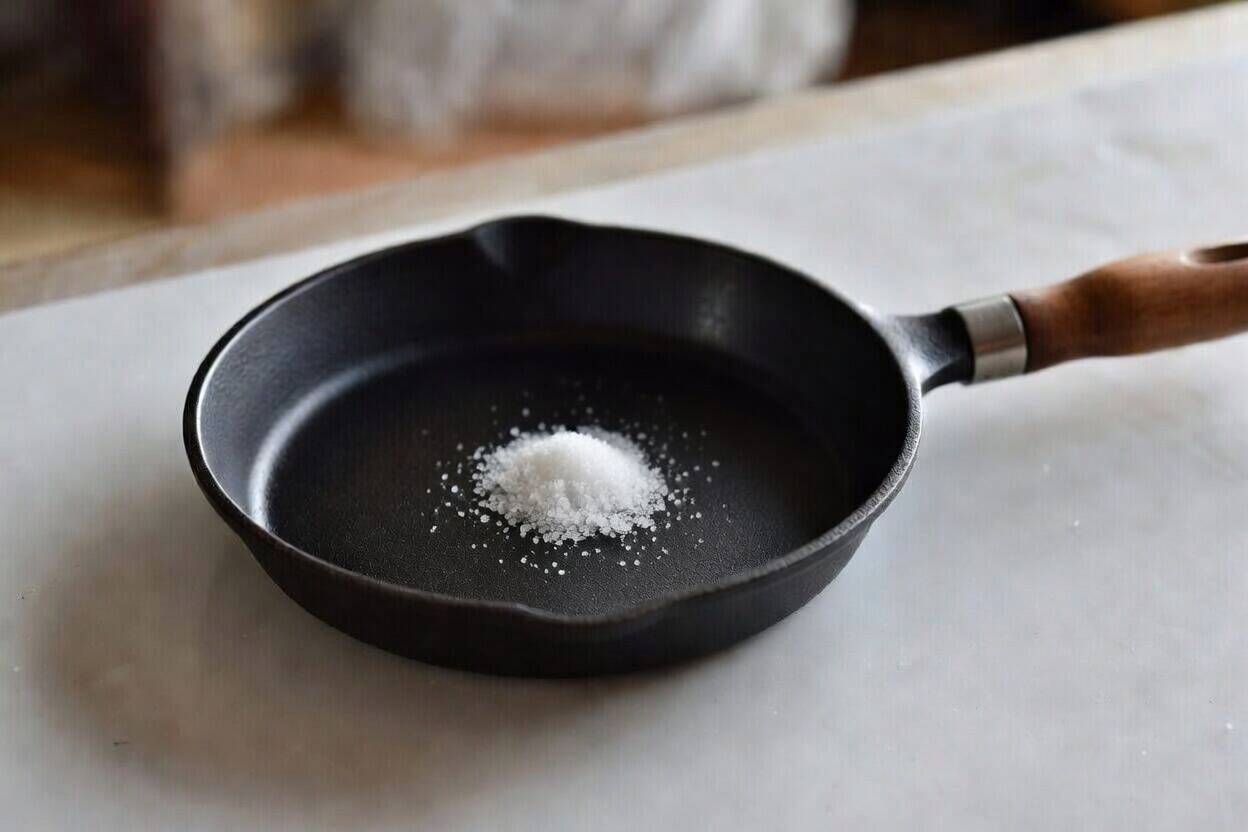 Один из самых надежных и проверенных способов. Крупная соль действует как мягкий абразив, который снимает нагар, не повреждая поверхность. Это особенно важно для чугуна, который не любит агрессивную химию и длительное воздействие воды.