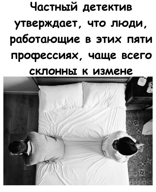 Частный детектив Пол Эванс в интервью изданию Metro составил список из пяти профессий, представители которых, по его наблюдениям, чаще всего изменяют по самым разным причинам.
