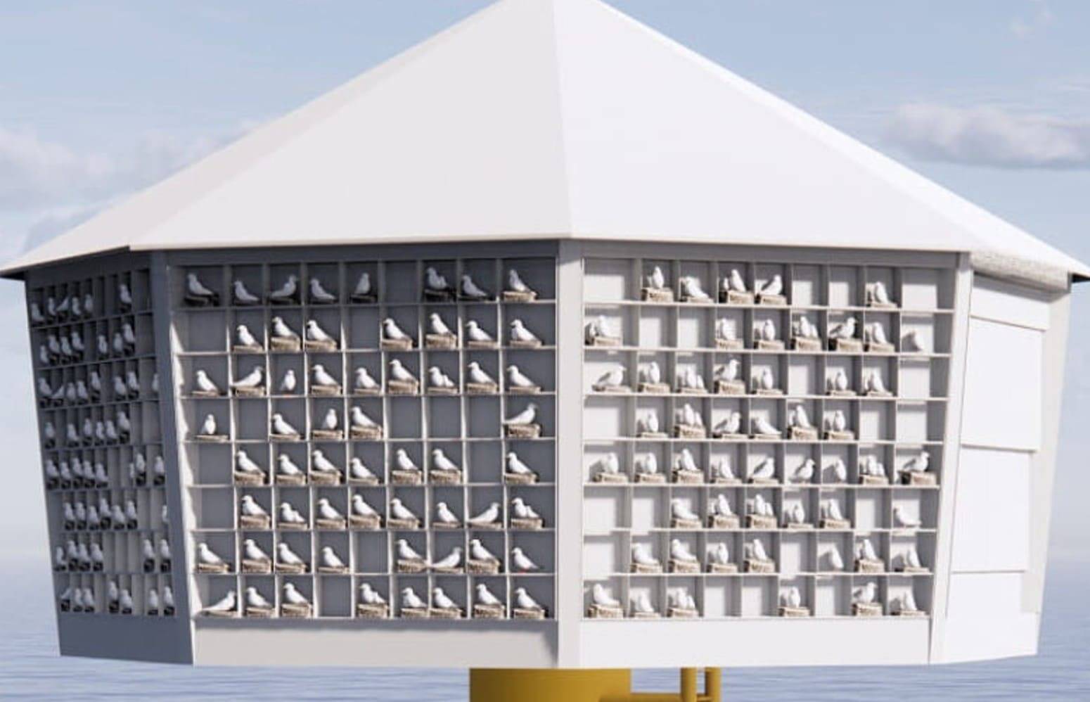 Энергетические компании совместно с орнитологами, инженерами и дизайнерами начали проектировать и устанавливать такие искусственные гнёзда в океане — конструкции, которые по форме напоминают природные утёсы, но намного крупнее, и внутри которых предусмотрено множество ниш и площадок для птиц.