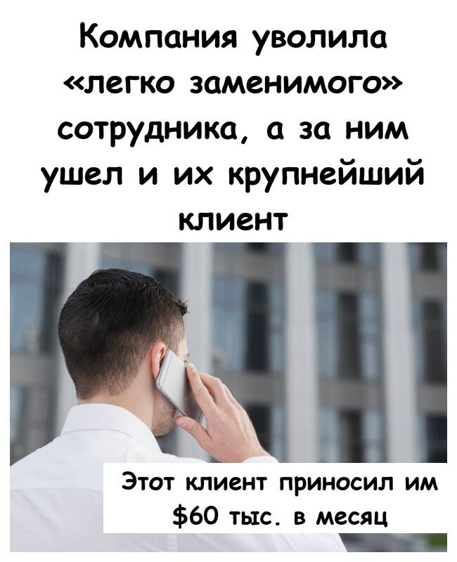 Я же вёл их крупнейшего клиента, делал для него все проекты. После моего увольнения клиент позвонил мне с обычными вопросами, и я сказал, что меня уволили и я там больше не работаю. Потом по слухам узнал, что моя бывшая компания с трудом справляется с нагрузкой, хотя они и наняли нового человека.