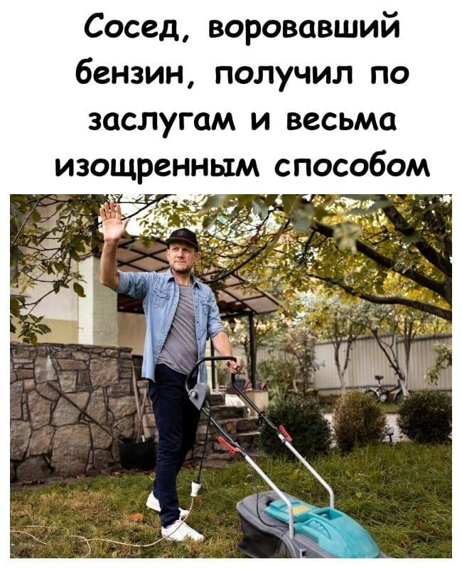 Вернулся домой примерно через час. И вижу: вор у себя во дворе дёргает шнур своей газонокосилки с такой яростью, будто его сейчас инсульт хватит. Краснеет, ругается. Потом садится в машину, проезжает пару кварталов — и она внезапно глохнет…