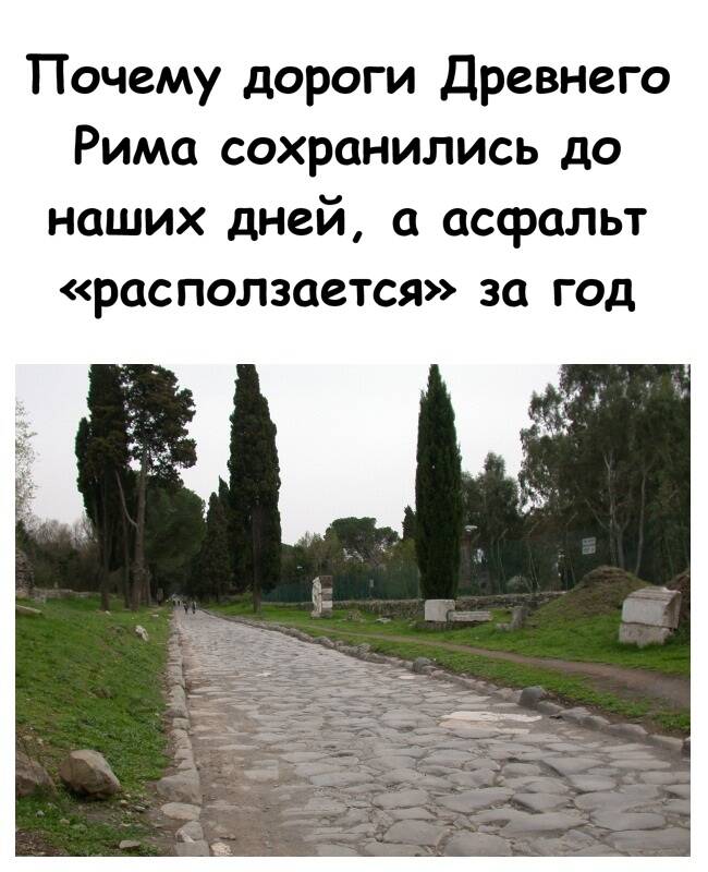 В-третьих, материалы. Камень и древнеримский бетон обладали высокой долговечностью. Исследования показывают, что римский бетон даже со временем может становиться прочнее благодаря химическим процессам внутри структуры. Асфальт же — материал мягкий и чувствительный к температурным перепадам.