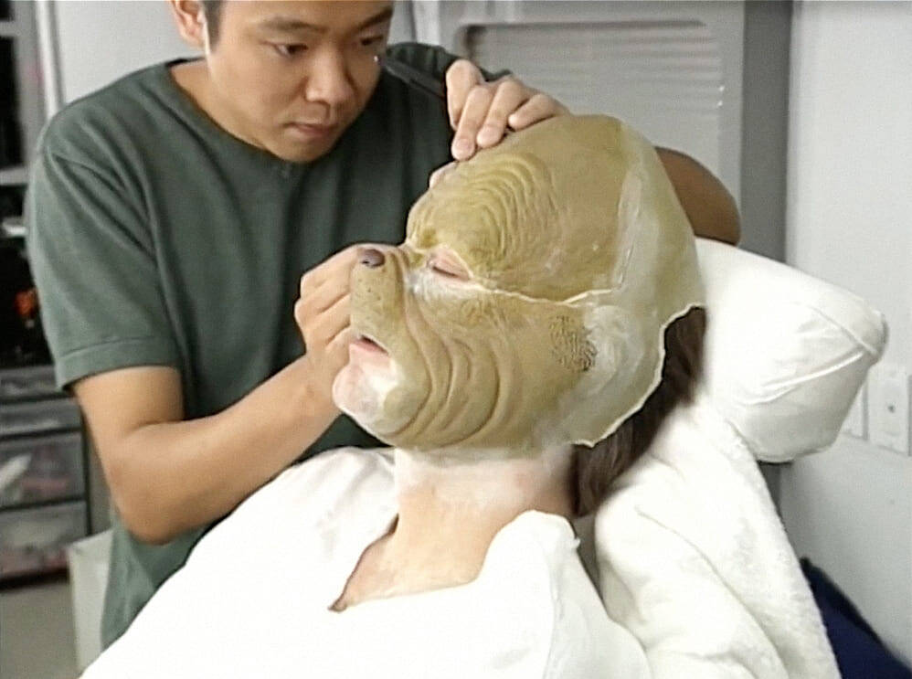 Каждый съёмочный день начинался с многочасового гримирования: на лицо актёра наносили сложные силиконовые протезы, поверх которых надевали тяжёлый костюм из искусственного меха, практически не пропускавший воздух. В этом «коконе» Керри едва мог дышать, перегревался и испытывал приступы паники.